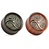 Su bonito motivo con tres espirales tiene una simetría en cada uno de sus puntos, y está hecho en una placa de latón, que contrasta estupendamente con el color de la madera.