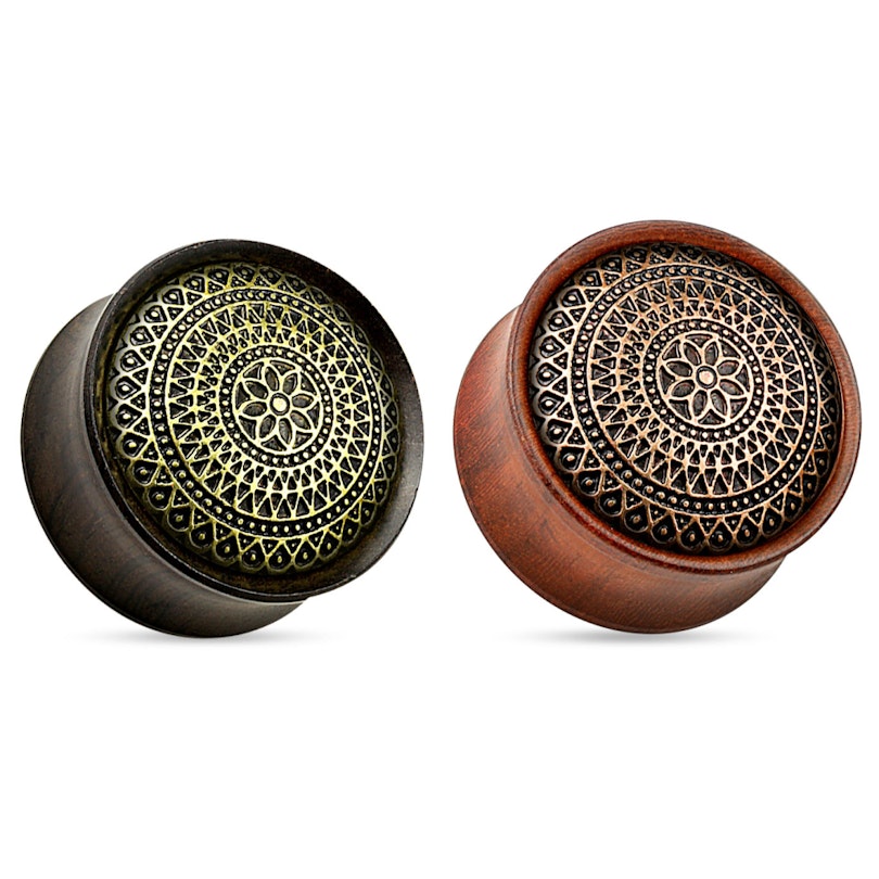 Los materiales orgánicos como la madera permiten que la piel de tu perforación pueda transpirar aunque lleves puesta una joya, y de esta manera también te permite evitar los olores desagradables. Este plug está disponible en dos tipos de madera distintos. Elige entre el color claro de la madera de palisandro o el color oscuro del diospyros. La parte frontal del plug está hecha en latón: en el modelo de palisandro el latón tiene un color rojizo, mientras que para el otro modelo tiene el color del latón normal. De cualquier modo, ambos diseños contrastan con el color natural de la madera. El color dorado del plug oscuro le da a la joya un look antiguo, mientras que el plug rojizo armoniza con el motivo dorado.