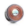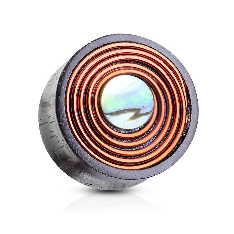 La parte frontal de la joya trae un pequeño disco de nácar en el centro, rodeado por un alambre de cobre. Suena un poco extraño si lo lees sin haber visto las joyas, pero en realidad se luce muy bien sobre el plug.