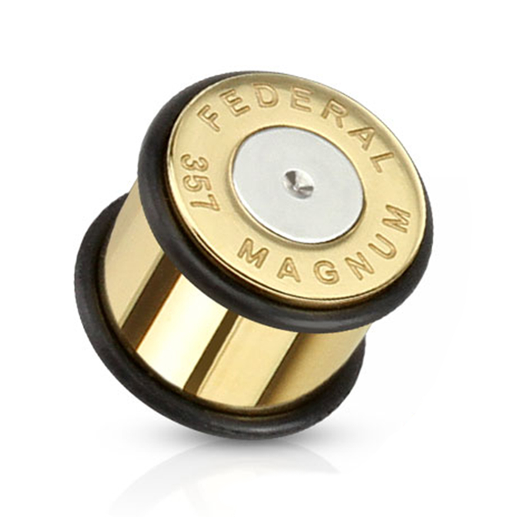 Se trata de un plug que puedes llevar en tus dilataciones. Tiene forma de cartucho de bala, Magnum con calibre .357, que dispara balas de 9 mm. Desafortunadamente, los plugs, así como los túneles, se cuentan en números pares. Por este motivo este plug no es del tamaño exacto de los cartuchos. Sin embargo está disponible en 6 tamaños distintos, desde los 6 mm hasta los 16 mm.