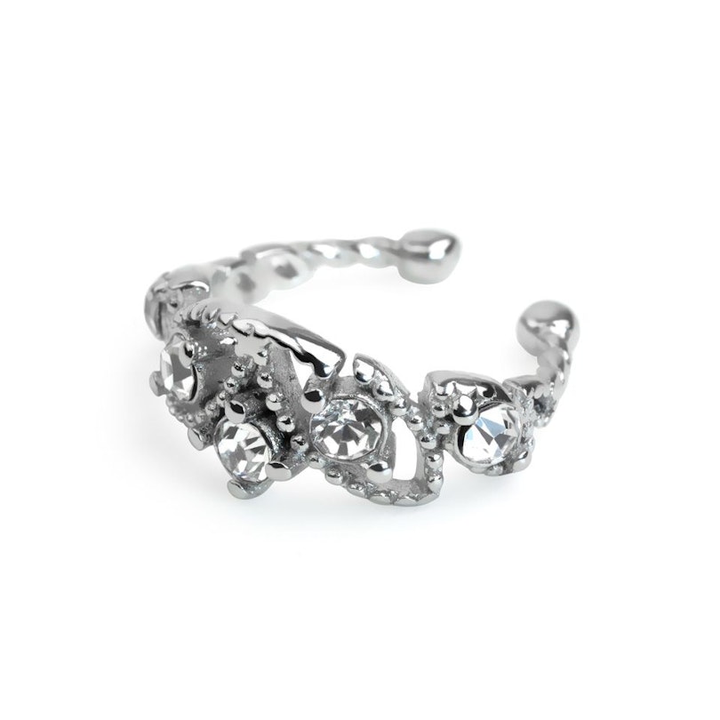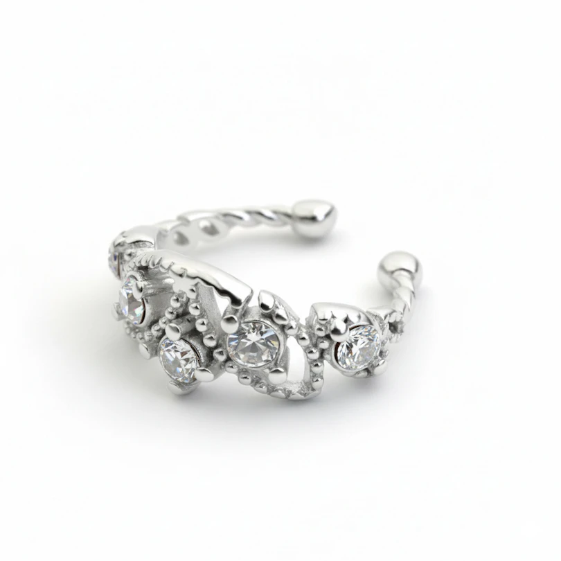 Precioso ear cuff con piedras brillantes y bolitas enmarcadas en un elaborado diseño. Al estar hecho de acero quirúrgico no irrita la piel y mantiene su brillo.
