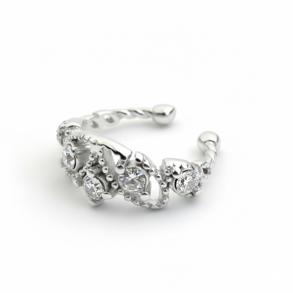 Precioso ear cuff con piedras brillantes y bolitas enmarcadas en un elaborado diseño. Al estar hecho de acero quirúrgico no irrita la piel y mantiene su brillo.