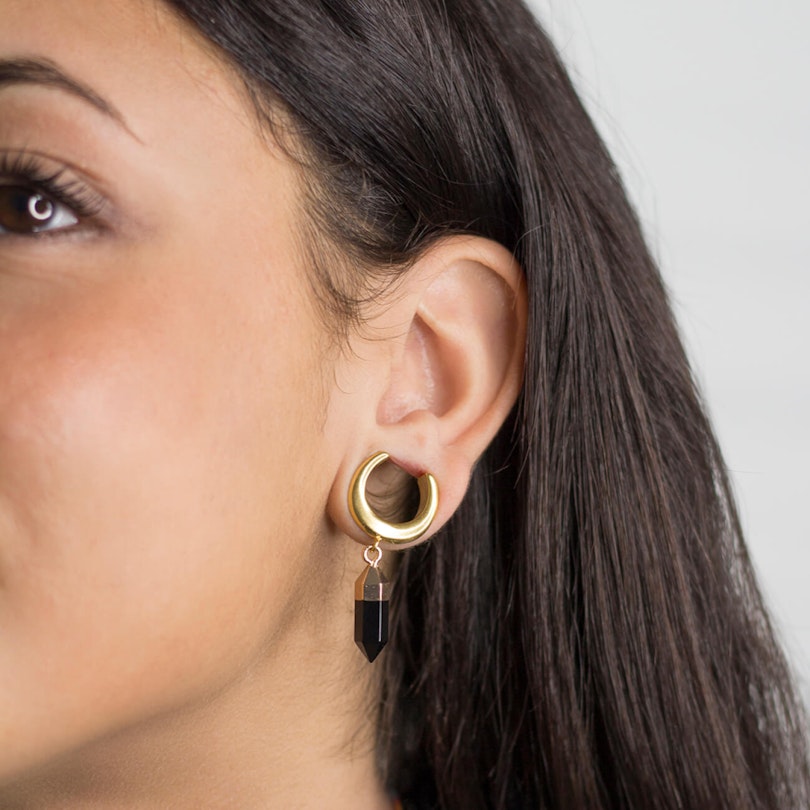 La parte superior de la joya está abierta, con los extremos curvados para ajustarse al lóbulo de la oreja. Deberás tener una dilatación de mínimo 10 mm para poder usar esta joya. Por otra parte, no tendrás que limitarte al tamaño máximo de 25 mm, ya que el modelo más grande, de 25 mm, se puede usar en dilataciones mayores de 25 mm.