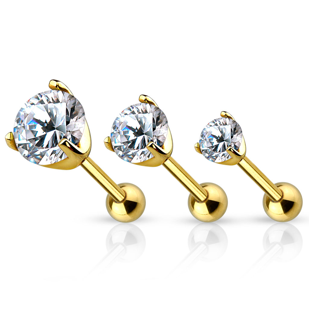 Esta es tu oportunidad de llevarte un lujoso set de tres pendientes para la oreja hechos en oro puro. Estos fabulosos pendientes tienen un grosor de barra de 1,2 mm y por eso se ajustan perfectamente a las perforaciones hechas con aguja. Cada pendiente tiene además un bonito brillante claro, pero en tres tamaños distintos: uno de 2 mm, otro de 3 mm y otro de 4 mm.