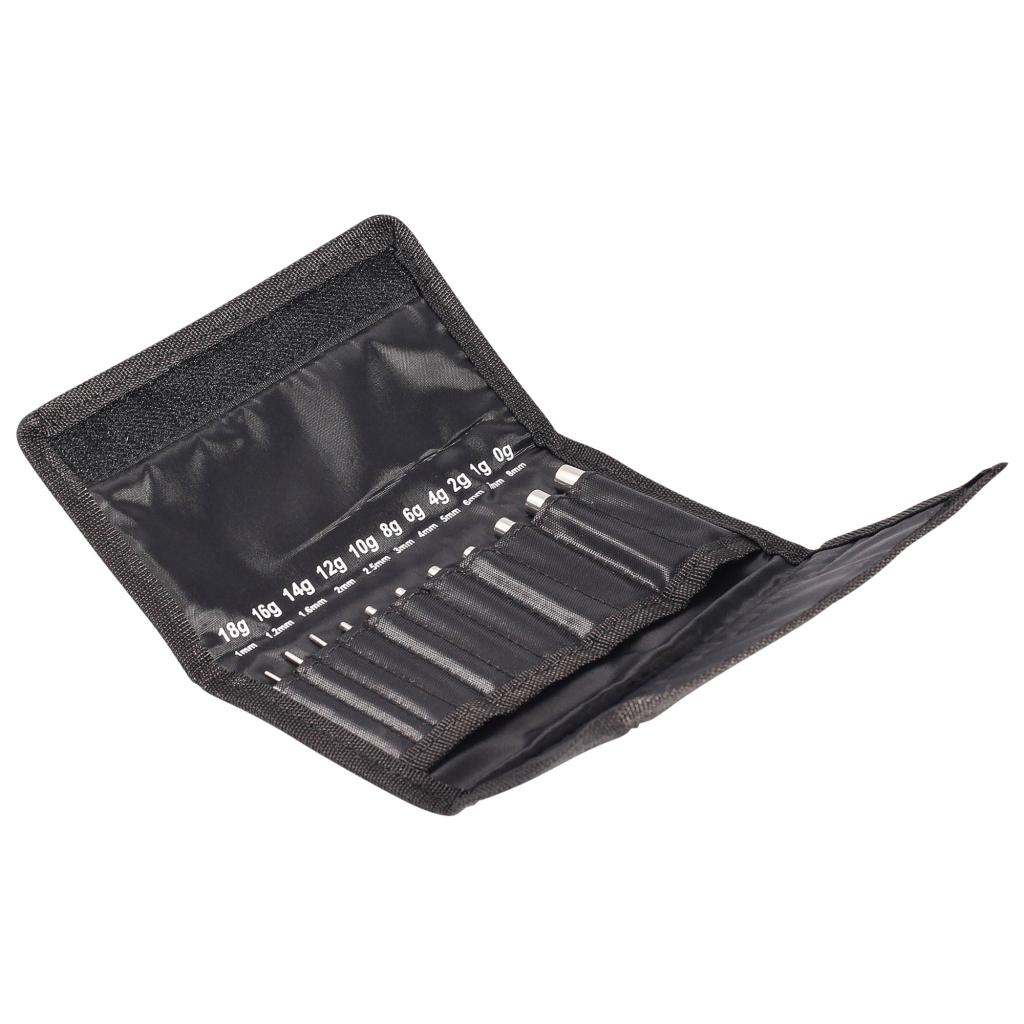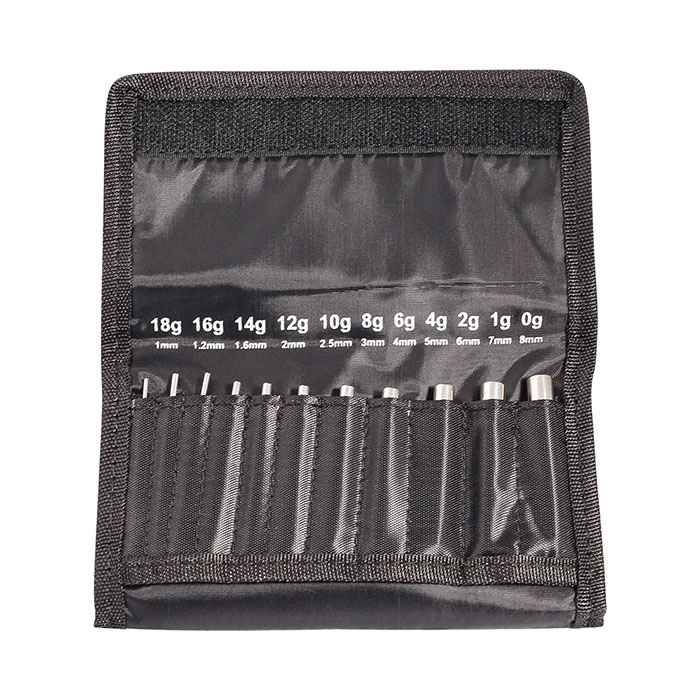 El set pequeño incluye tapers de 1 mm hasta 8 mm. El set grande incluye tapers desde los 10 mm hasta los 20 mm. Lo que es común a ambos es que en su parte más gruesa tienen un orificio cuyo tamaño corresponde al grosor de barra de las joyas que te quieras colocar. Esto significa que el taper de 10 mm tiene un grosor de 11 mm en su parte más gruesa, de modo que te permitirá colocarte joyas de 10 mm con la mayor comodidad.