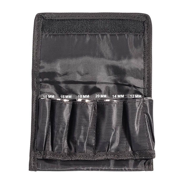 Ambos sets incluyen un estuche de color negro, del mismo tamaño que un portamonedas. El set se abre y se cierra con velcro.