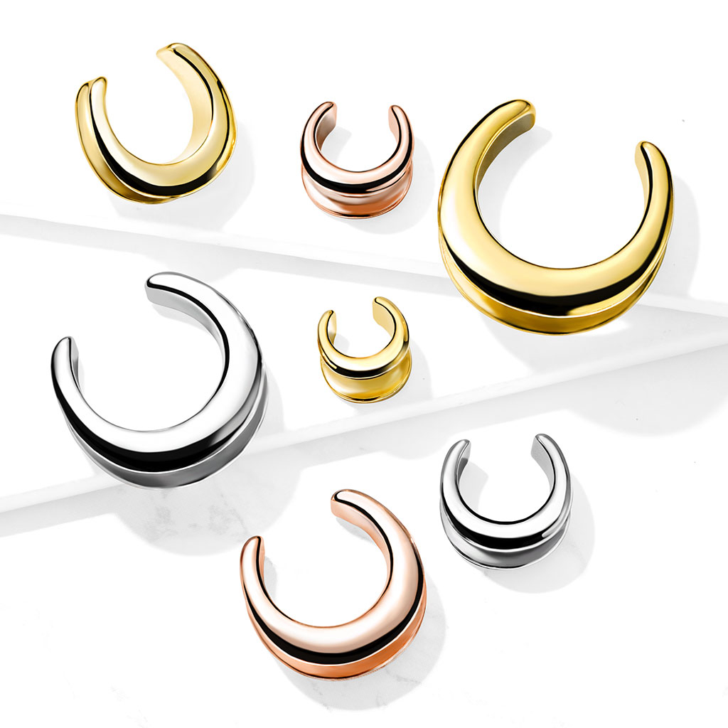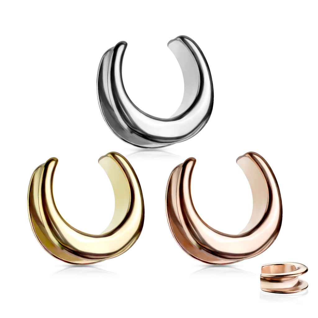 La joya que ves aquí es un poco difícil de categorizar. Se llama saddle spreader, y no es ni un túnel, ni un plug, ni un hanger. Tampoco es un taper. Lo que más se le parece es quizás un túnel porque puedes ver a través de él. No obstante, este está abierto en la parte superior, lo que te da la ventaja de poder ponértelo aunque tu dilatación sea más grande que el diámetro de la joya. Los extremos del spreader miran hacia dentro, siguiendo la forma de tu dilatación. De este modo, aunque sea más pequeña que tu dilatación, la joya no se caerá.