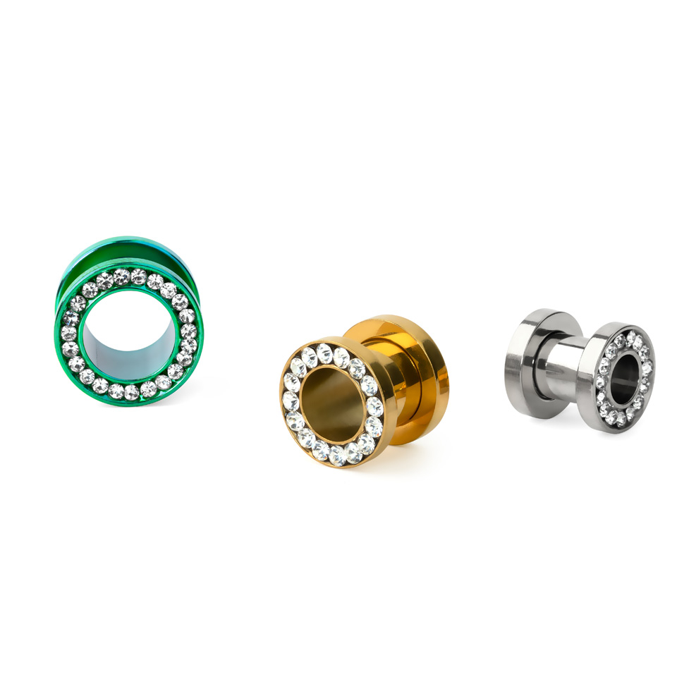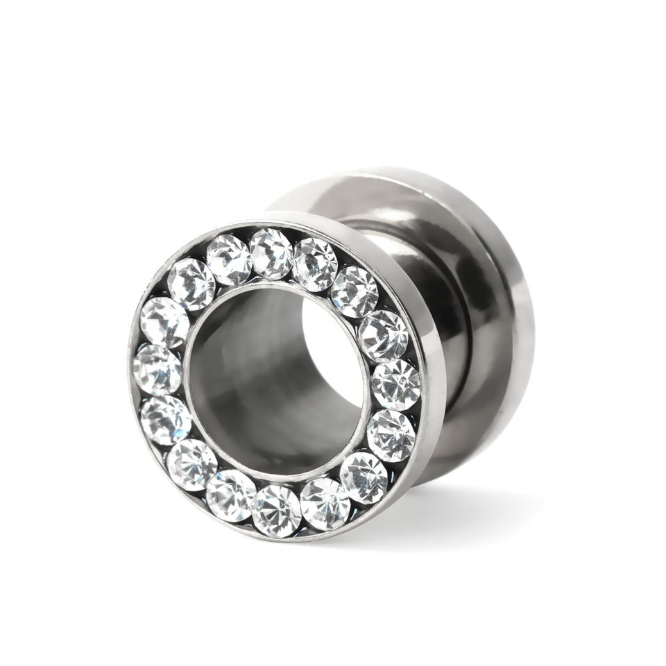 Estupendo túnel clásico de acero quirúrgico, disponible en varios colores y tamaños. El canto de estos túneles está decorado con varios brillantes encastrados, uno a continuación del otro, cubriéndolo todo. Este túnel está disponible en muchos tamaños distintos, y seguro que hay uno favorito para cada uno/a.