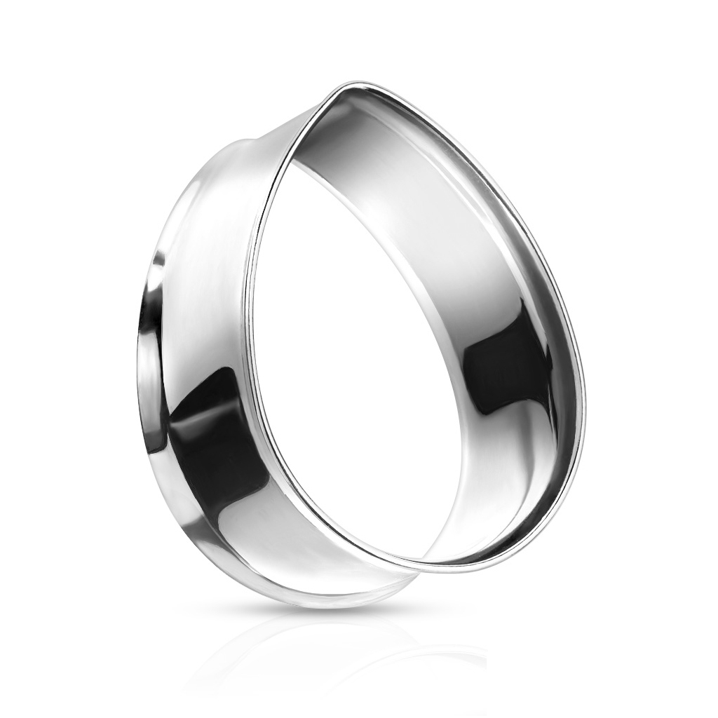 El túnel que ves en la imagen es de acero quirúrgico. El metal tiene un grosor increíblemente fino, por lo que la joya puede parecer más pequeña de lo que es. Tiene un grosor de aproximadamente 0.5 mm. El túnel tiene forma de gota, o de pera si lo prefieres. Se podría decir que la gota es bastante gordita.