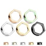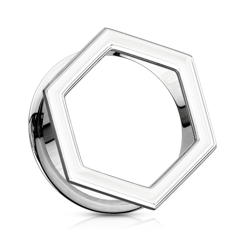 Esta original joya de acero quirúrgico presenta un diseño hexagonal en su parte superior, además de una elevación en la parte trasera. Al estar doblemente elevado en sus extremos, el túnel tiene un perfecto calce. Estas elevaciones hacen que se torne innecesario que venga con roscas.