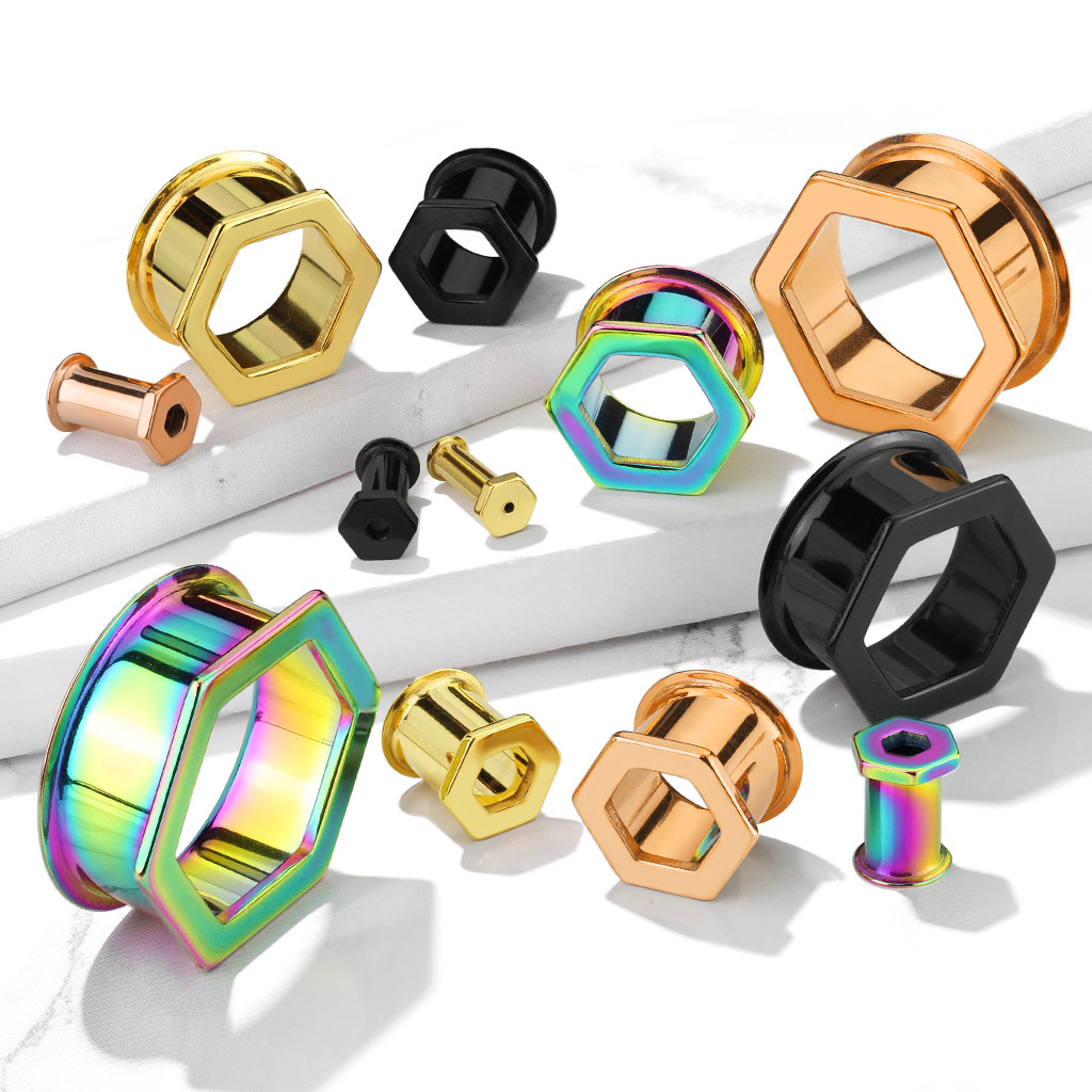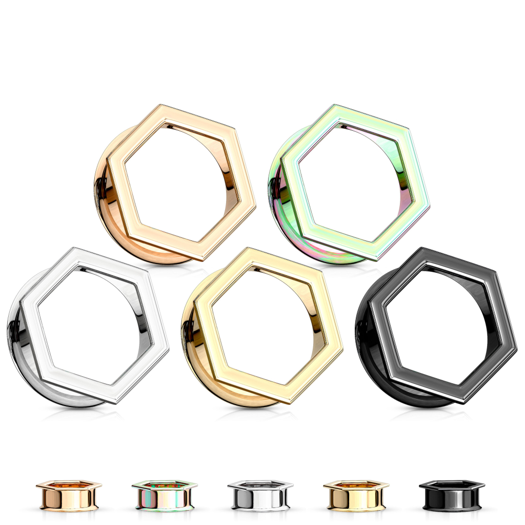 Esta original joya de acero quirúrgico presenta un diseño hexagonal en su parte superior, además de una elevación en la parte trasera. Al estar doblemente elevado en sus extremos, el túnel tiene un perfecto calce. Estas elevaciones hacen que se torne innecesario que venga con roscas.