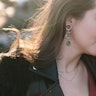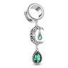 La medialuna está adornada con un diseño de filigrana con bonitos trazos decorativos. Dentro del arco de la luna cuelga la primera piedra en forma de lágrima. La segunda cuelga por debajo de la luna, y como puedes ver en la imagen, es más grande que la primera.