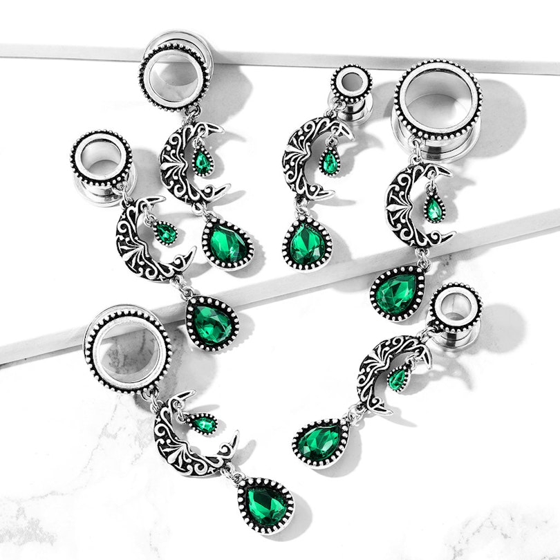 Puedes elegir el túnel entre varios diámetros, lo que supone la única diferencia entre los modelos. La medialuna y las piedras de color esmeralda tienen las mismas medidas en todos los modelos, no cambian dependiendo del diámetro del túnel.