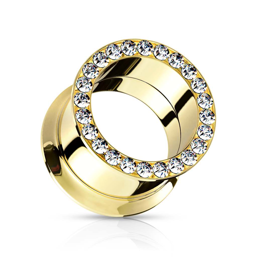 Este túnel está hecho de acero quirúrgico chapado en oro y está adornado con pequeños brillantes claros, encastrados alrededor del canto.